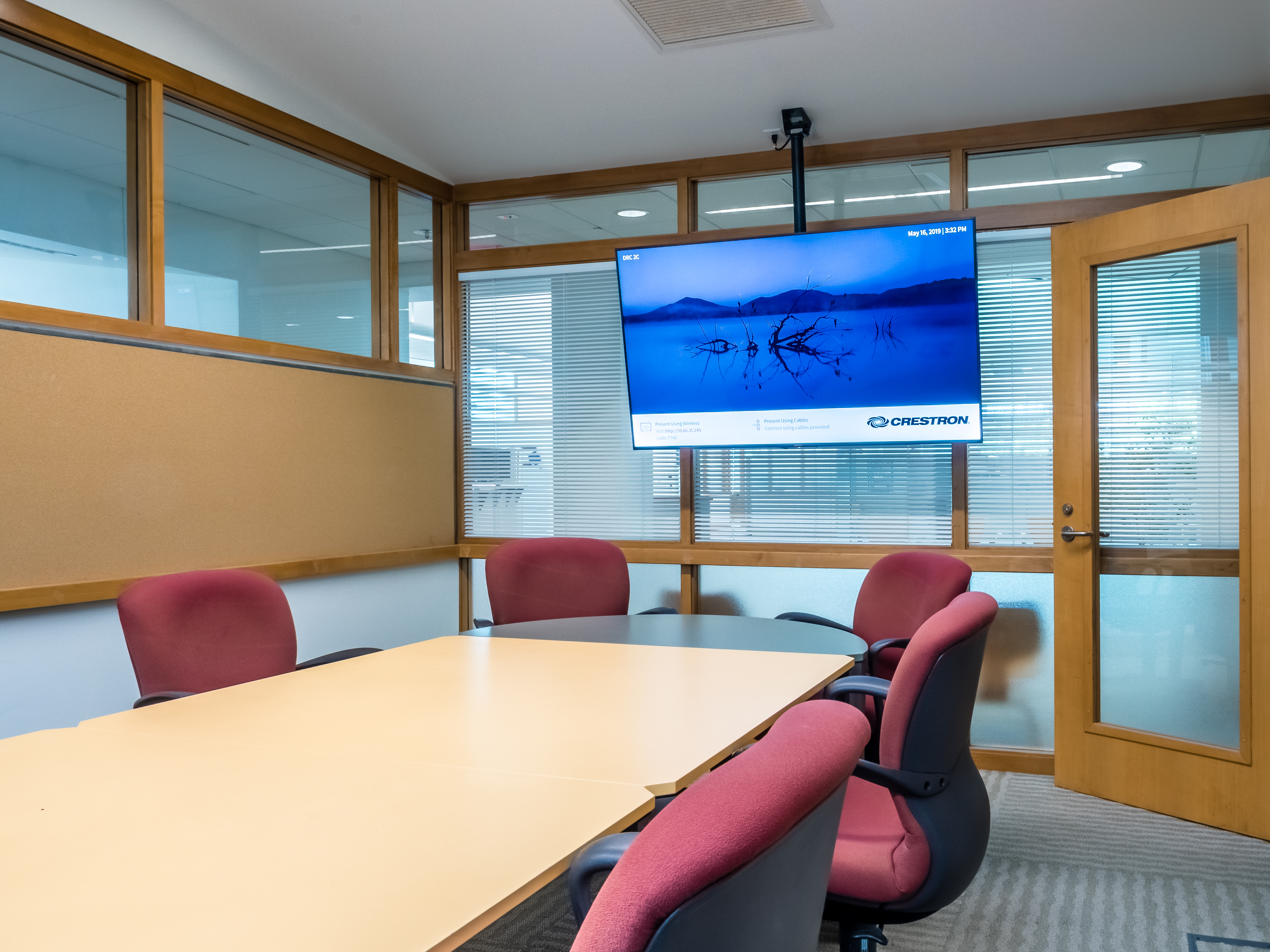The glass also prevented us from running wire, so basically everything in the room had to be wireless. So we installed a wireless occupancy sensor that turns the TV on and off, and we placed a Crestron Airmedia onto the back of the TV, which allows users to be able to present content wirelessly from any mobile device.