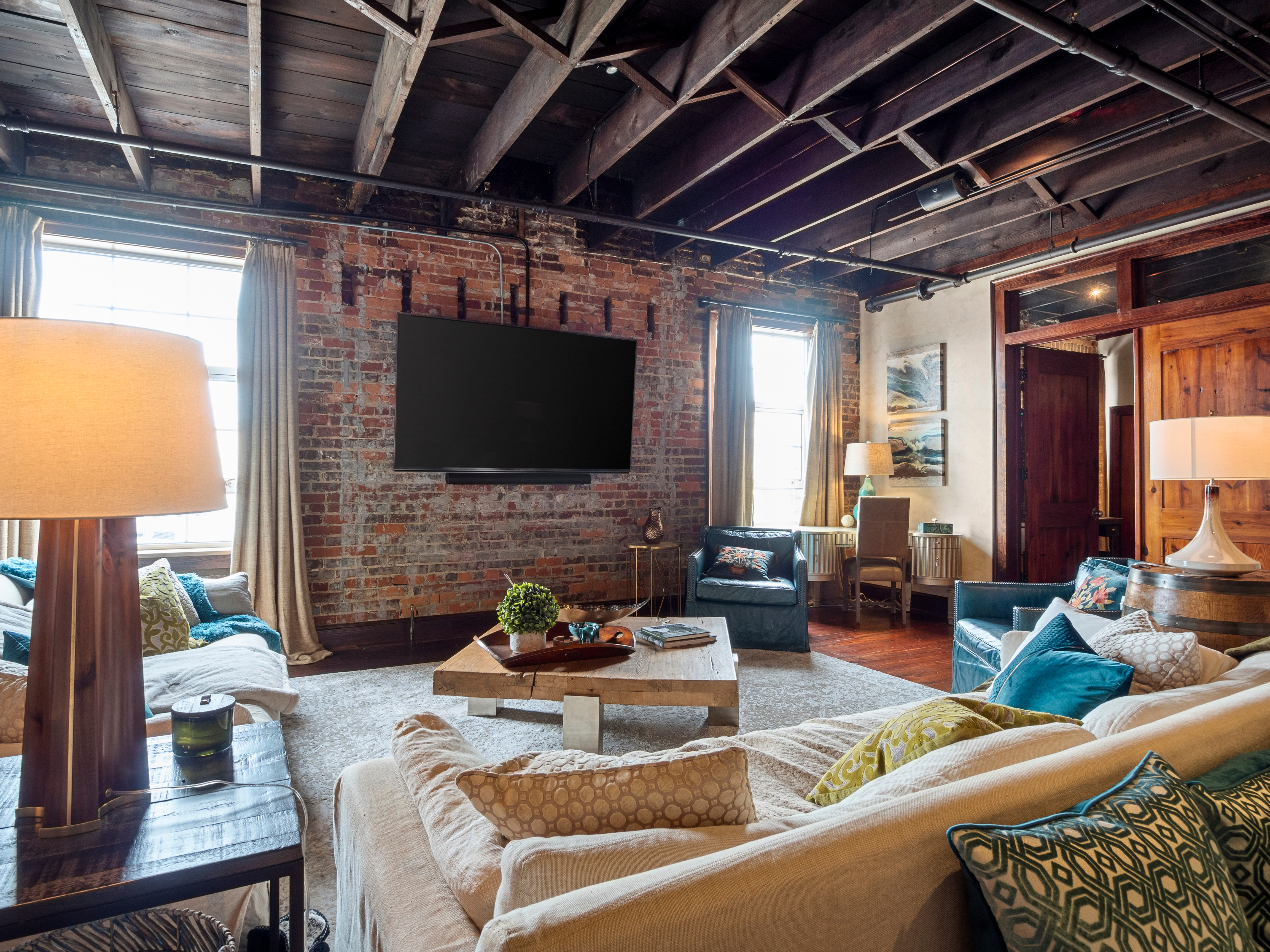 Some spaces that we enter have such a distinct character that we do our best to make choices that will disrupt that aesthetic as little as possible. In this gorgeous downtown condo, we did a few upgrades while preserving the look and feel of the condo. For instance, we installed a new 85" 8K Sony Smart TV in the Great Room, mounting it on a fixed mount to the brick wall. Under the TV, we mounted a Sonos Arc soundbar. The challenge with mounting to brick or stone is figuring out how to get the wiring back to a power source. Typically, we partner with an electrician to run conduit from the TV to the power source, and we run our wiring through that conduit. The look works well here, with the exposed brick, beams, and other industrial touches. We then placed a Sonos wireless subwoofer. By repurposing two of the ceiling speakers to a Sonos amp, we were able to create a full 5.1 surround sound system in the Great Room.