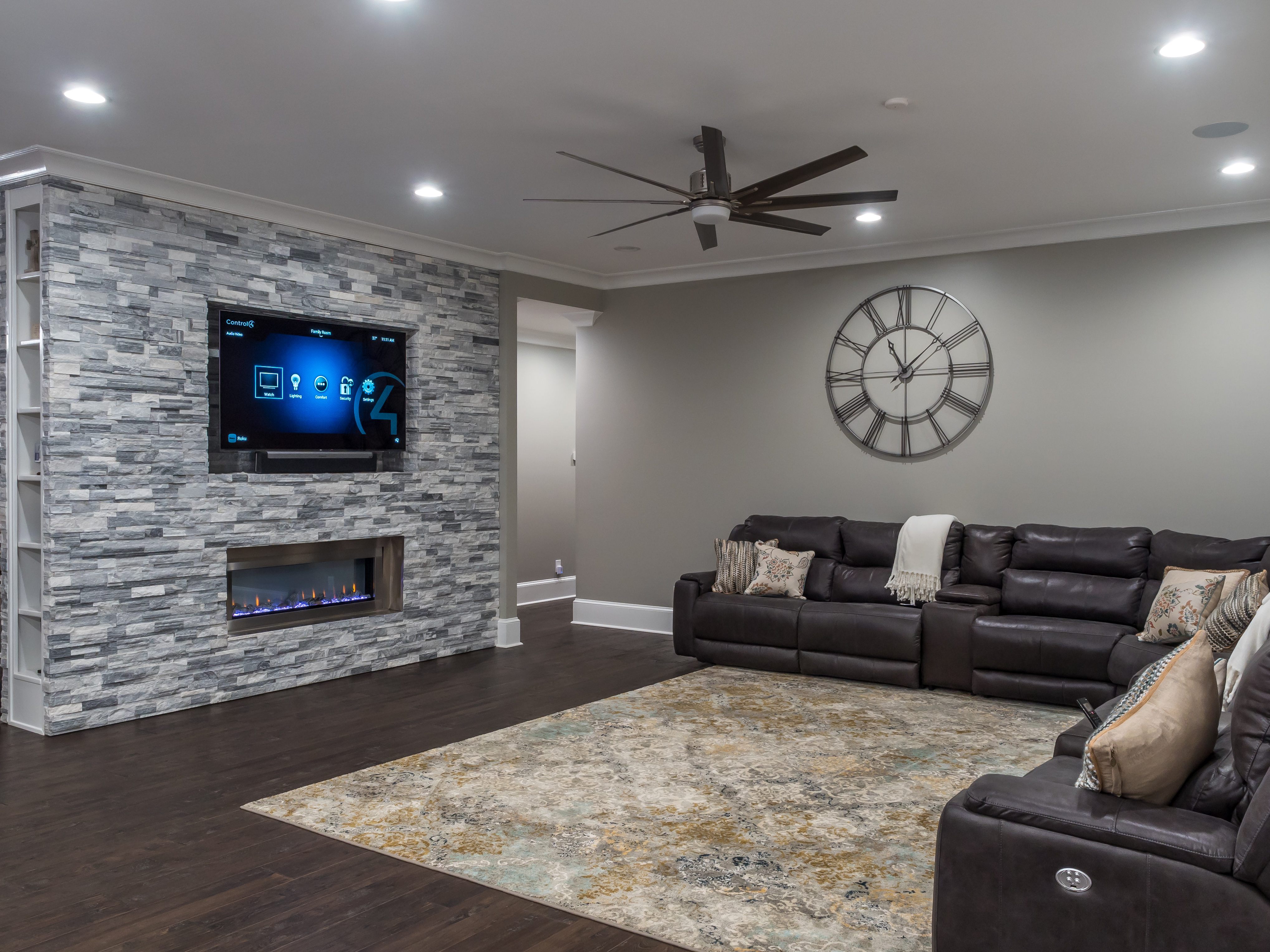 To control all of the audio, video, and security integration, we used a Control4 home automation system. To control the system, we supplied six handheld remotes that can perform all of the A/V functions, with the ability to add other home features, such as lighting, if the customer wants to add that in the future.