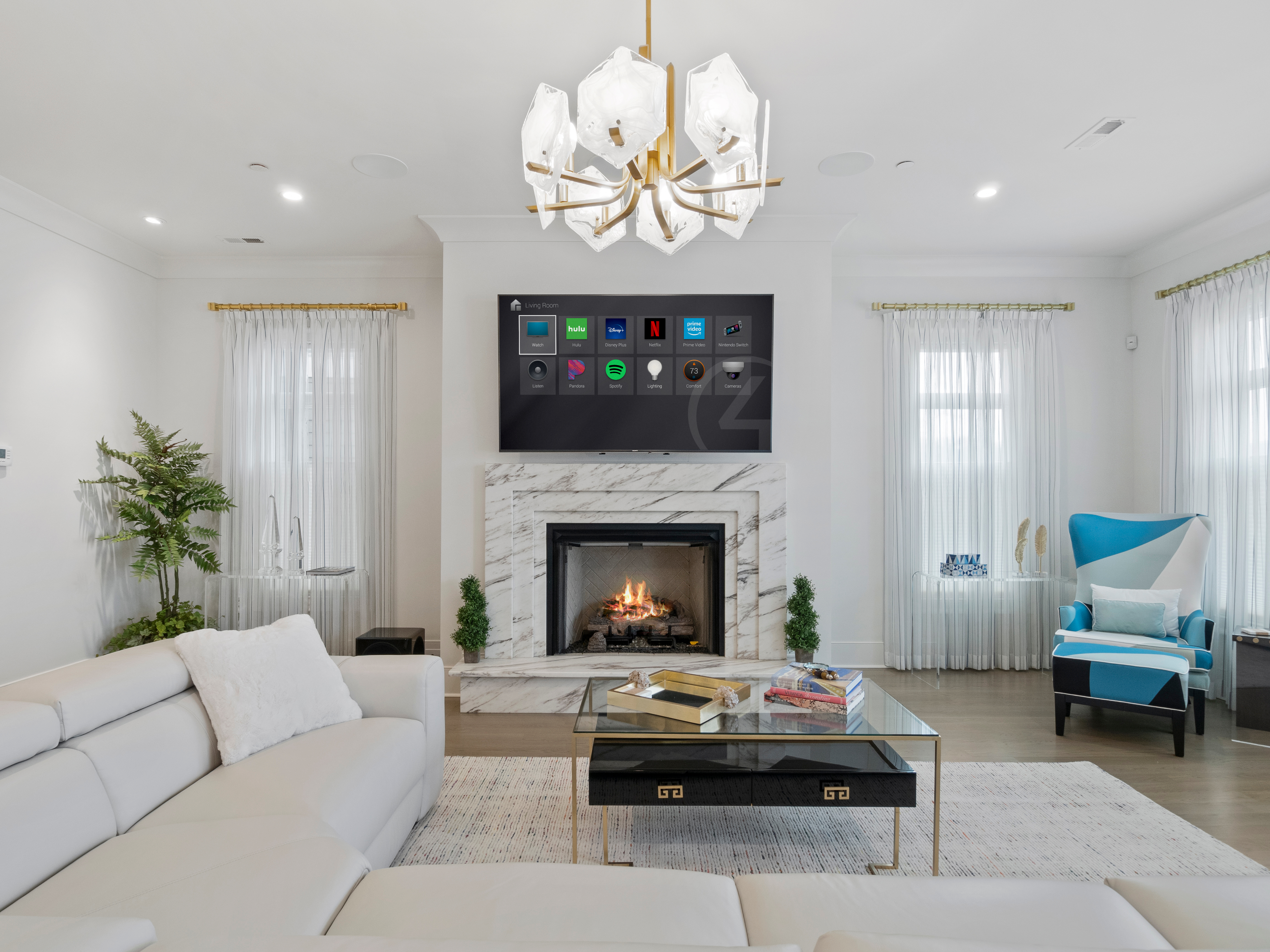 In the bedrooms, bath, and basement living area, we wall-mounted TVs with HDMI extenders to allow users to select from and control any source (cable, satellite, AppleTV) connected to the system. Each of these rooms can be controlled via handheld Control4 remote control or via the Control4 app. Additionally, the master bedroom has a 7" touchscreen above the lighting panel that can control the security system, and it also had added intercom capabilities.