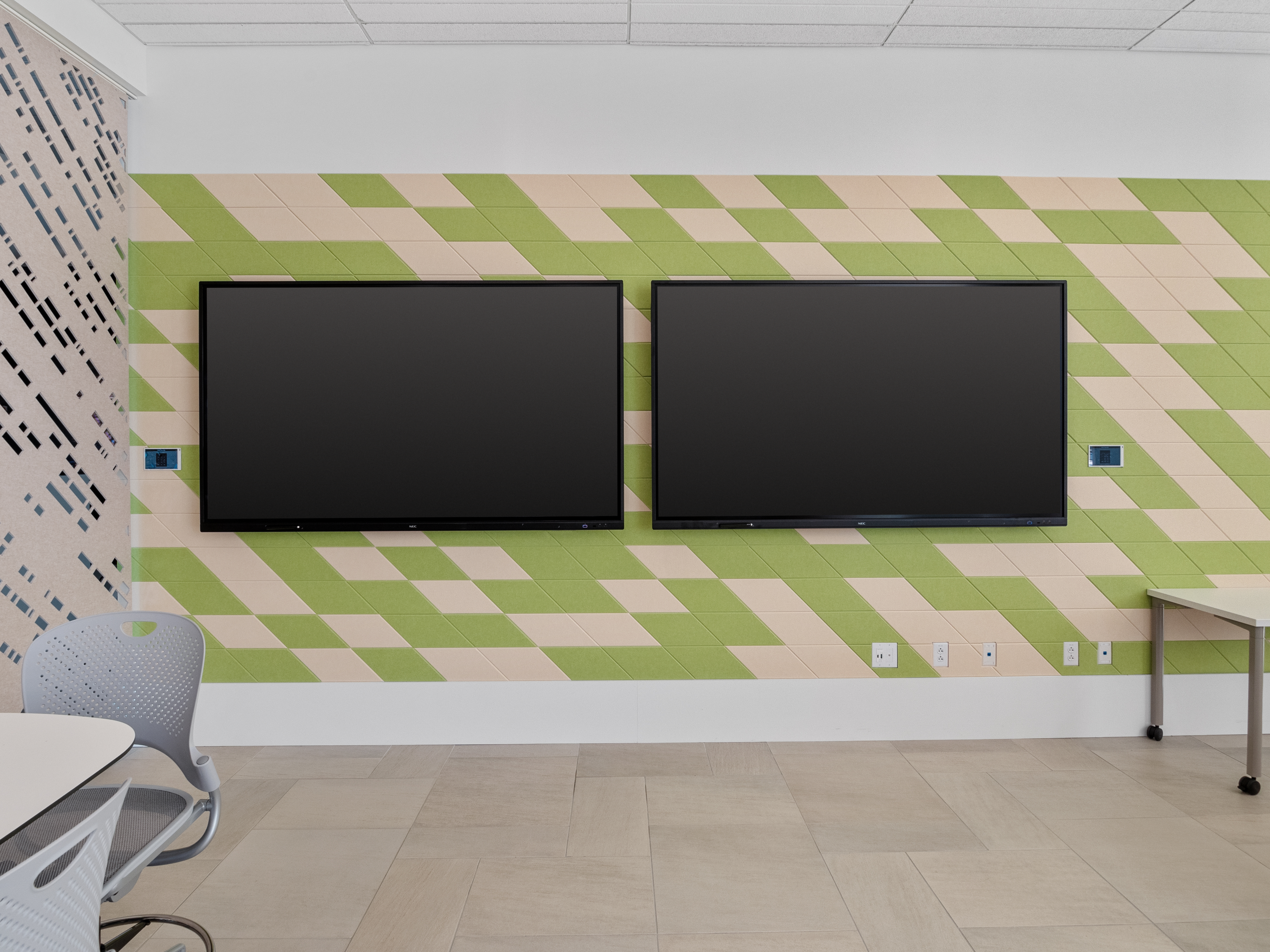 Because this is an open space that is adjacent to other lobby and office spaces, we installed three narrow dispersion speakers to provide audio to the space but minimize noise spillover to those other areas.
