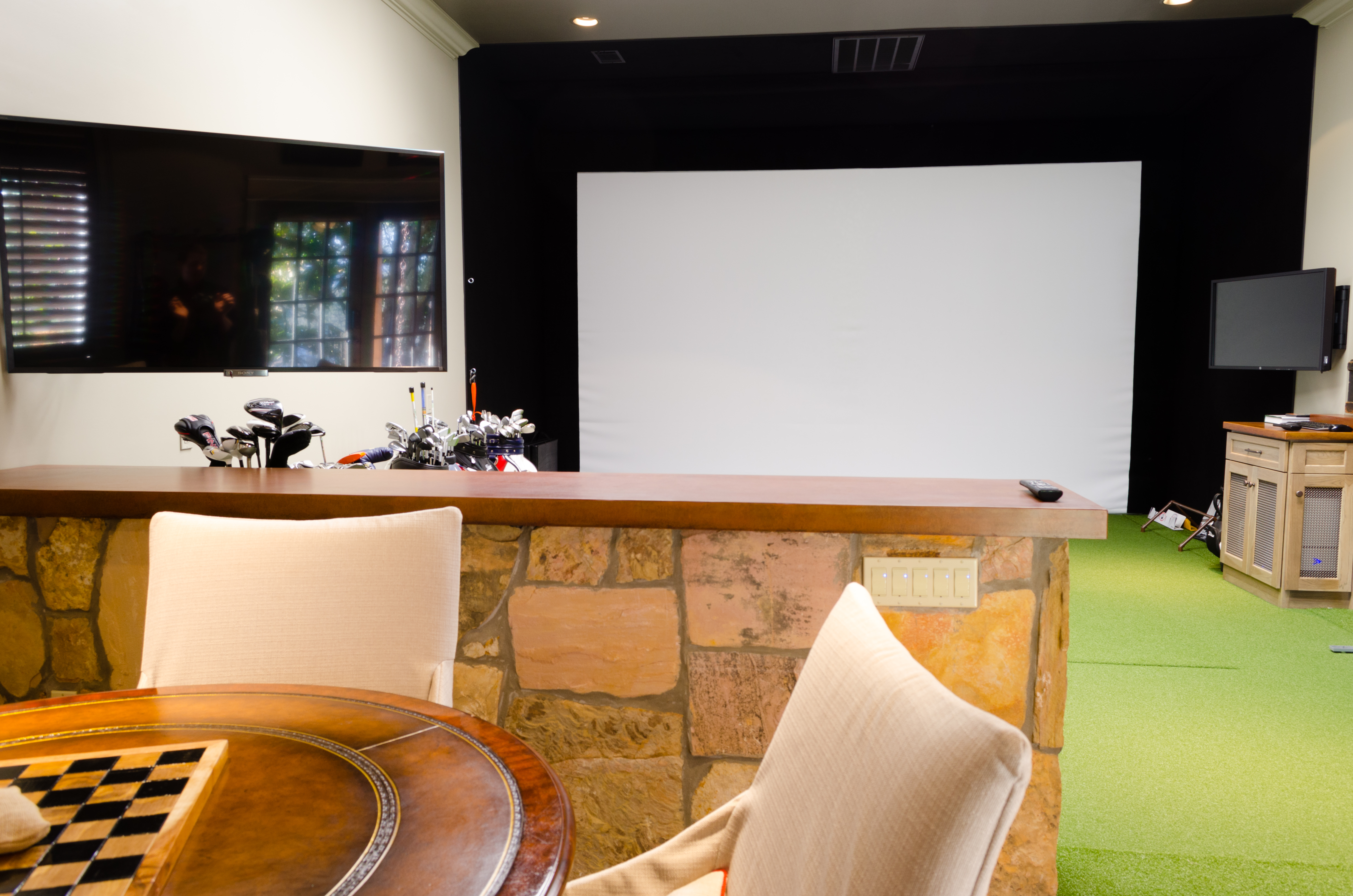 The space itself is one large room, but it is divided into two sections, the golf simulator, and then a separate hang out space equipped with a kitchen, bath, and seating area. Because it’s not a large space, we didn’t need to overwhelm it with too many TVs. Instead there is one fixed Sony TV in the kitchen area, and one Sony TV on a motorized mount that articulates 90 degrees so that you can choose to either watch from the golf area or the seating area. There is one more screen that accompanies the Trackman, which we also put on an articulating mount.