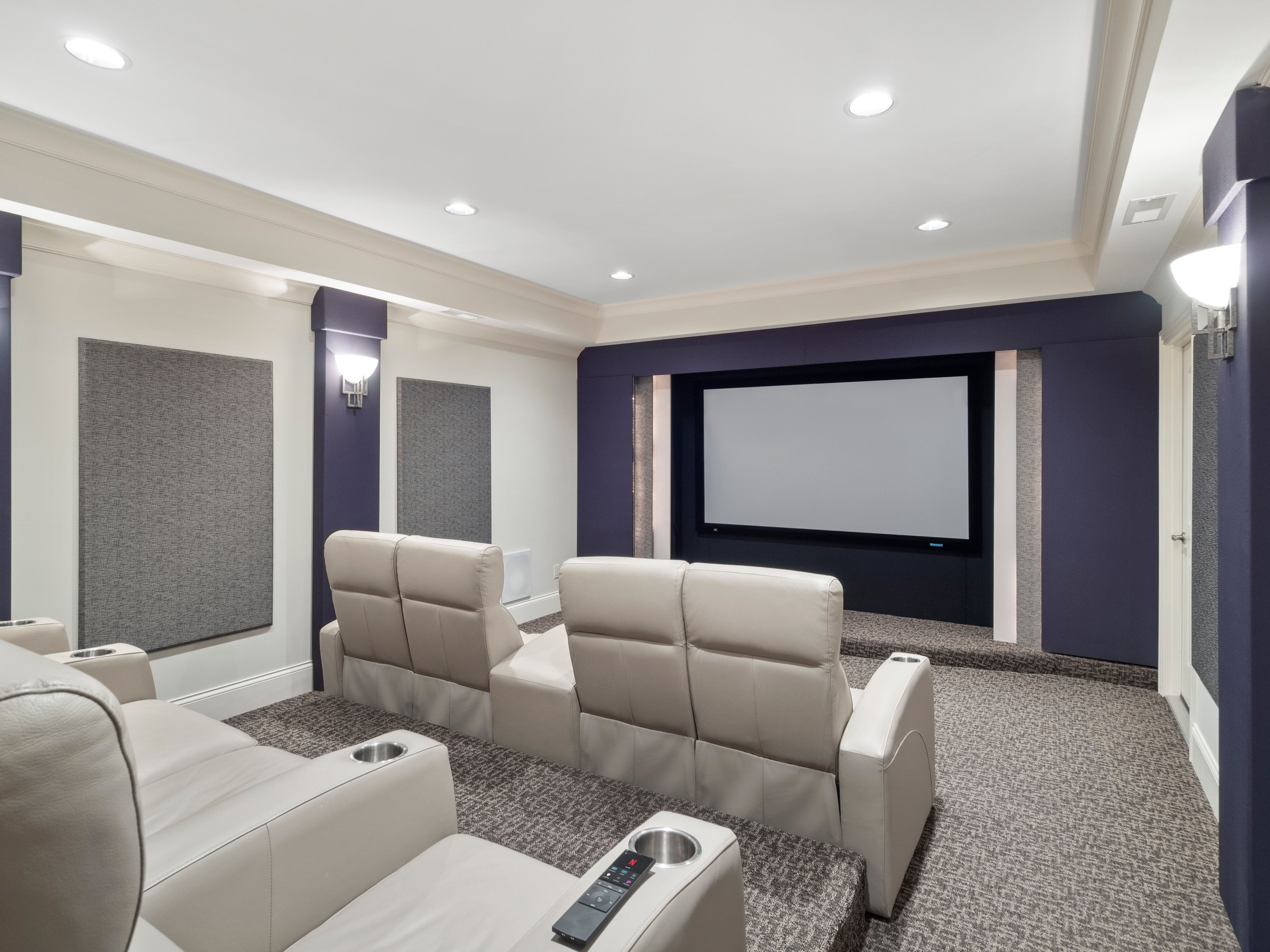 This home theater was part of a whole-home upgrade in which the home was switched over from an old control system to a newer Control4 system. This conversion meant that all of the remotes in the home would be upgraded to the sleek, new Control4 Neeo remotes, including the one in the theater. The projection screen didn't need replacing, but we upgraded the projector to a Sony HD 4K Projector. As part of the home upgrade, we added a Control4 EA-5 Entertainment and Automation Controller, which resulted in better and faster performance in the theater. We also placed a new Sony 4K AV Receiver, and all of these new elements combined made the theater run much more smoothly.