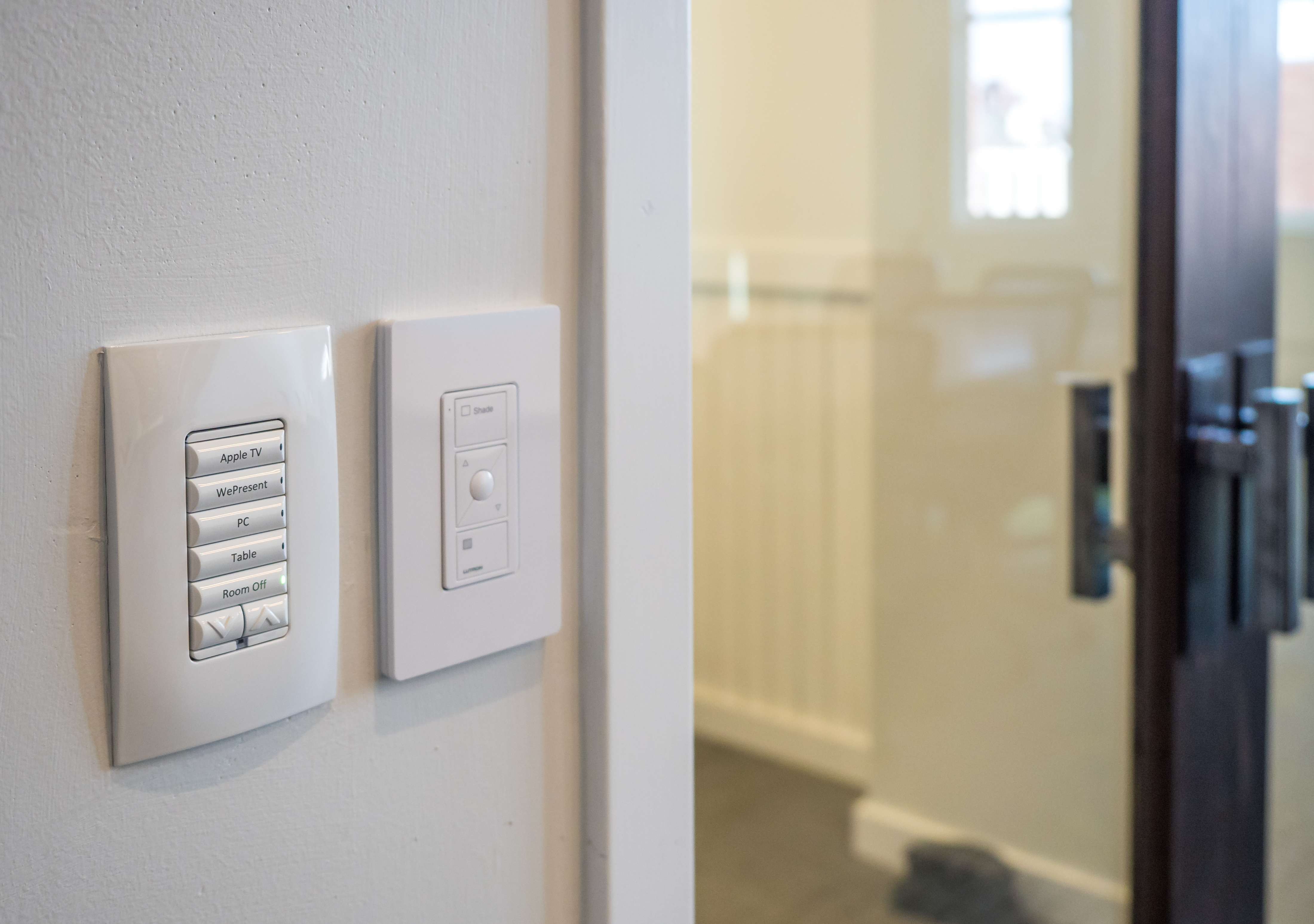 We added a new 4K AppleTV, a customer-supplied WePresent, and a customer-supplied PC to a nearby cabinet and interconnected them via a 4x1 HDMI switch. All the devices we connected to the switch can be viewed on the projection screen. To control the room, we went with a Control4 automation system to run all the electronics in the room. To give the room even more one-touch functionality, we placed a configurable keypad on the wall that allows users to select the source to view on the screen, as well as control volume, and control the power.