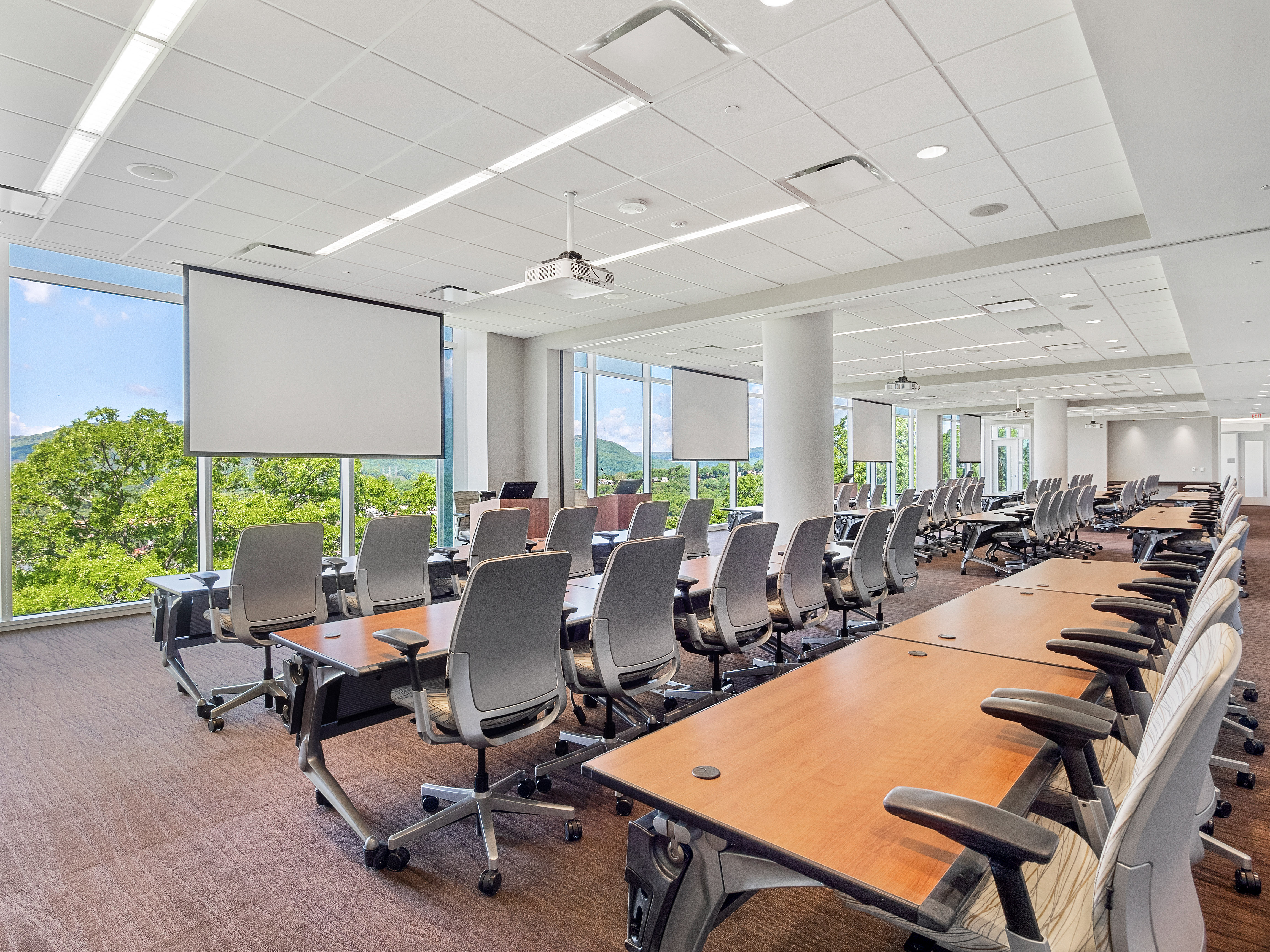 This training room is a unique space because it can function as one large room, or it can be divided into four separate training rooms that are controlled individually. Due to this, the project involved doing many of the same upgrades and enhancements four times over so that each space had equal and independent functionality.